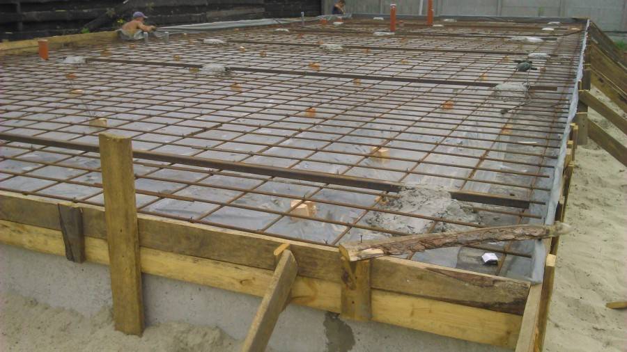 Армирующая сетка должна находиться внутри бетона и не выходить наружу. Ее монтируют на подставки, а потом заливают смесь.