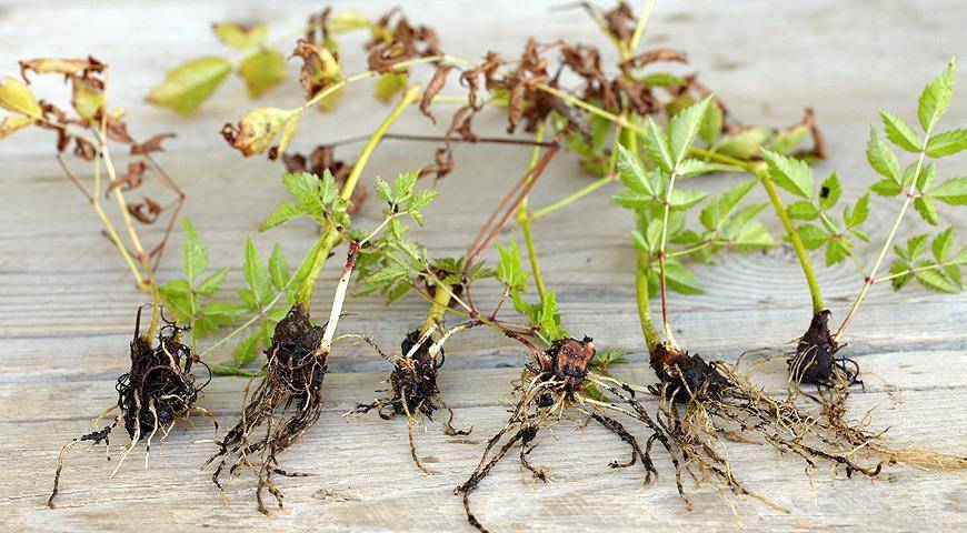 Растение выкапывают из грунта и осторожно делят его корень на несколько частей