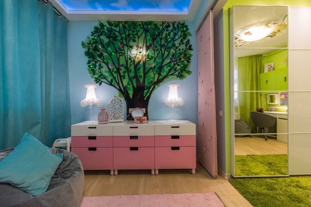 - Особого внимания достоин выбор и расположение спальных мест. Для одной из сестер подобрали кровать-чердак, для второй – комфортный диван-кровать.