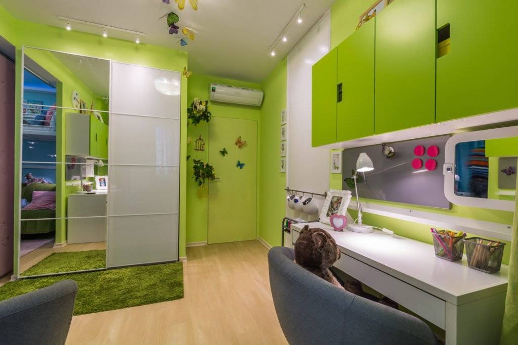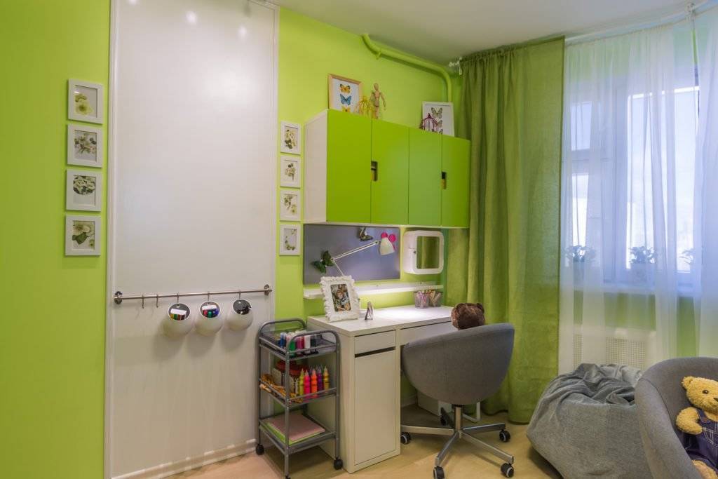 - Для разделения комнаты на две функциональные зоны была возведена небольшая перегородка с эркером. В этой части свое пристанище нашла рабочая/игровая зона. Для хранения вещей возведена ниша, в которую уместили платяной шкаф.