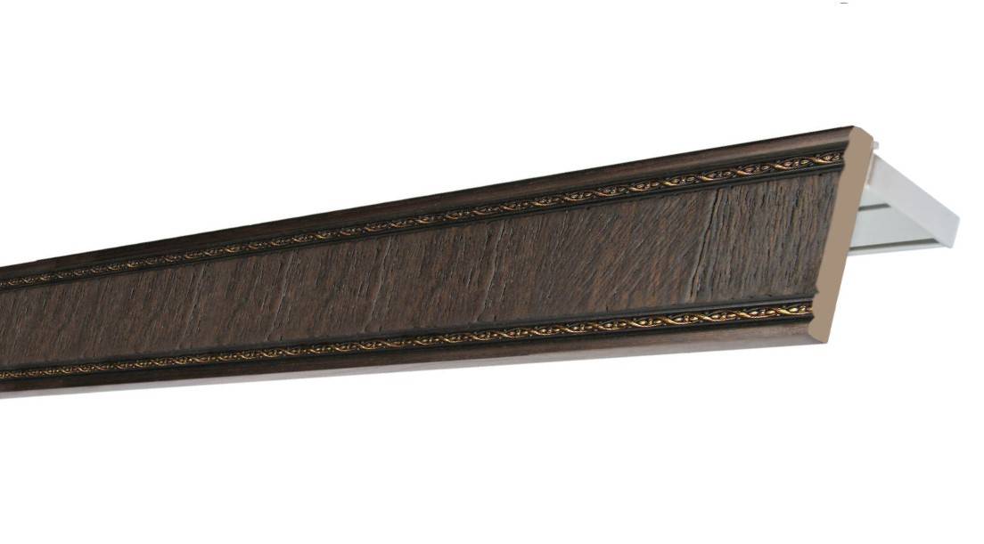 Наружная часть багета может быть украшена накладками, орнаментом или стеклянными вставками. Концы изделия выполняются угловыми или закругленными. Нижний край декоративной планки может иметь прямое или волнообразное исполнение. Такие карнизы изготавливаются из сосны, ореха, вишни, ели, дуба, бука, венге или красного дерева. Разные варианты можно увидеть на фото потолочных карнизов. Главным недостатком такого карниза является высокая стоимость.