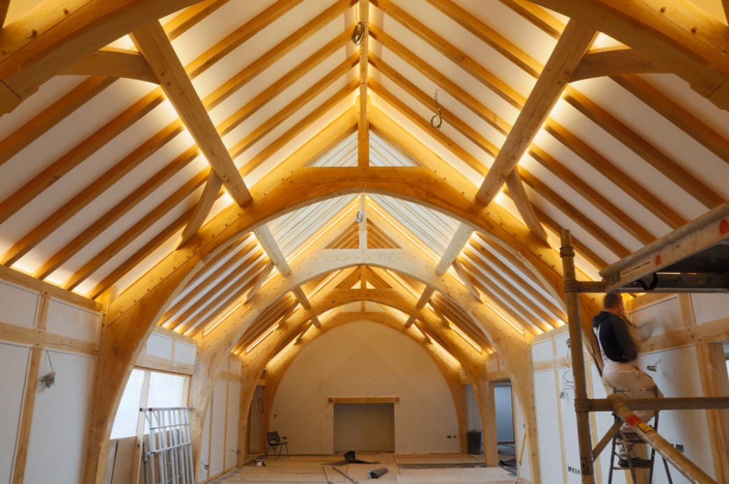 Конструкцию из деревянных балок можно дополнить разными источниками света на потолке.