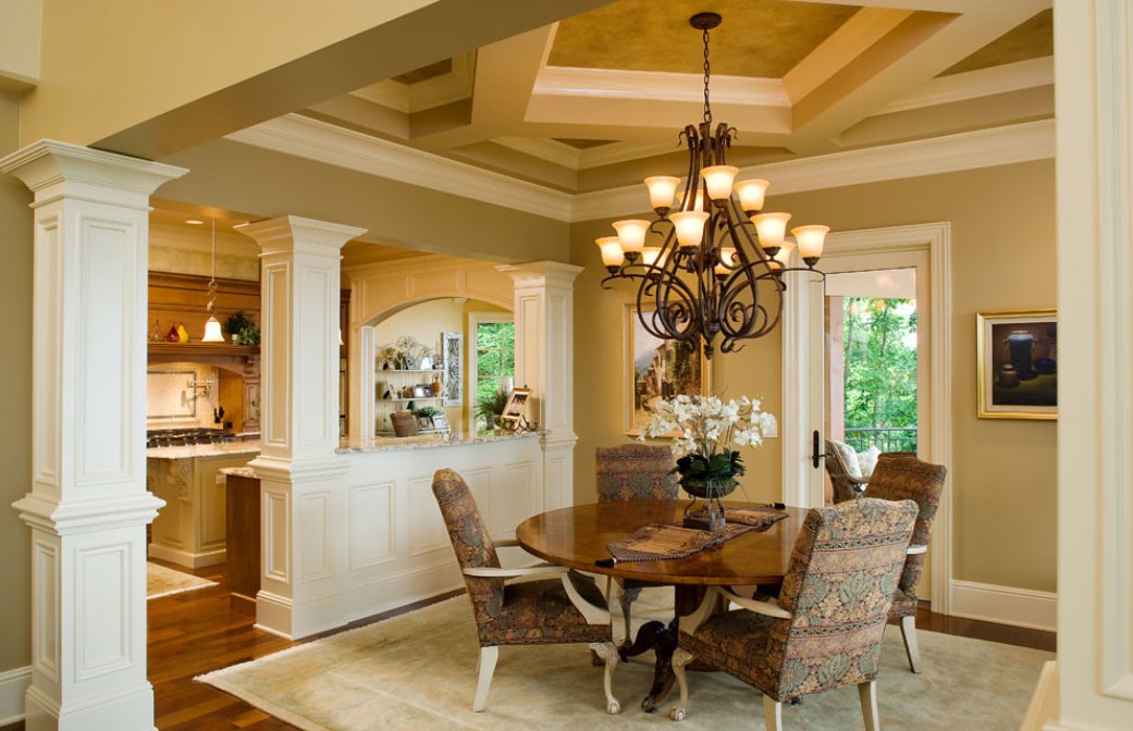 Классический стиль выигрышно будет смотреться с потолочными балками, расписанными виньетками, украшенные резьбой, оттененные золотом или серебром. Это будет смотреться роскошно и несколько помпезно.