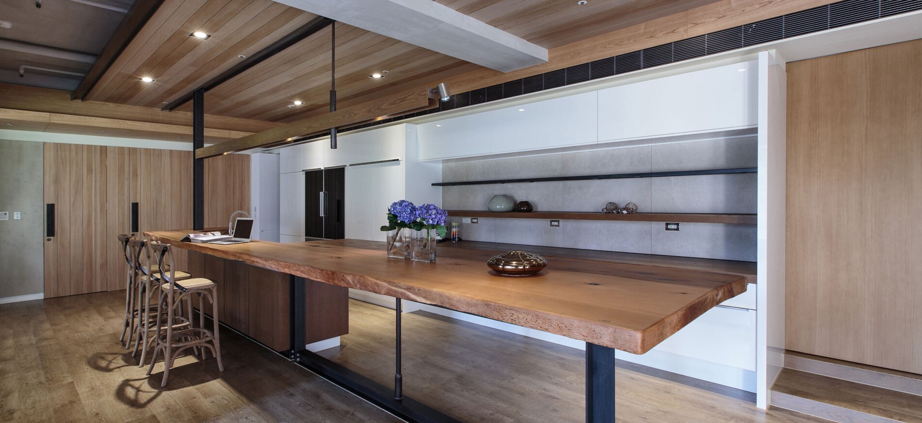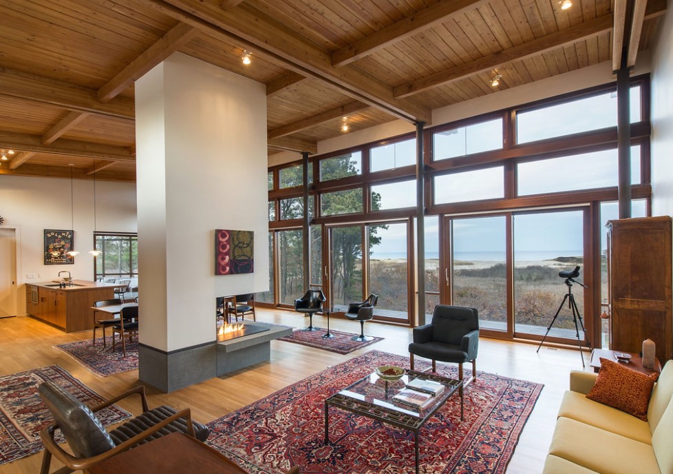 - В некоторых случаях целесообразно установить одну большую балку, чтобы зонировать помещение. Такой прием часто используют в кухне-столовой или столовой, совмещенной с гостиной.