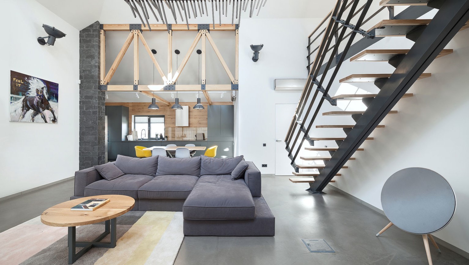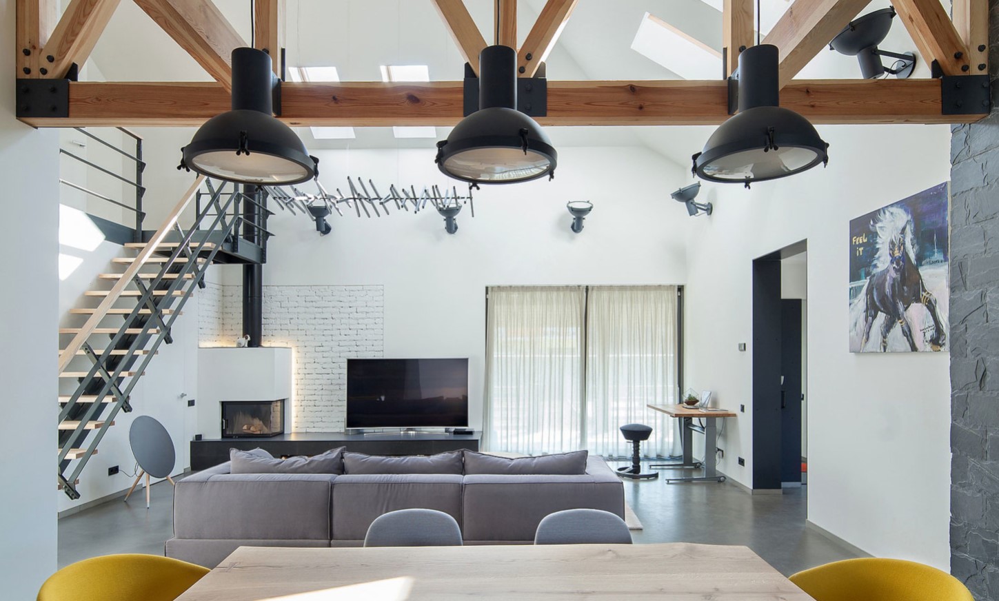 Еще один стиль, в котором можно использовать балочные конструкции и их имитацию, – лофт. В таких интерьерах нередко применяют отделку под необработанные поверхности из кирпича, бетона и древесины
