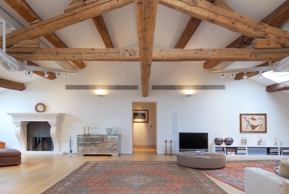 Общий стиль предусматривает наличие балок в интерьере. Так, сельский стиль, кантри и промышленный стиль отлично подходят для применения таких потолков