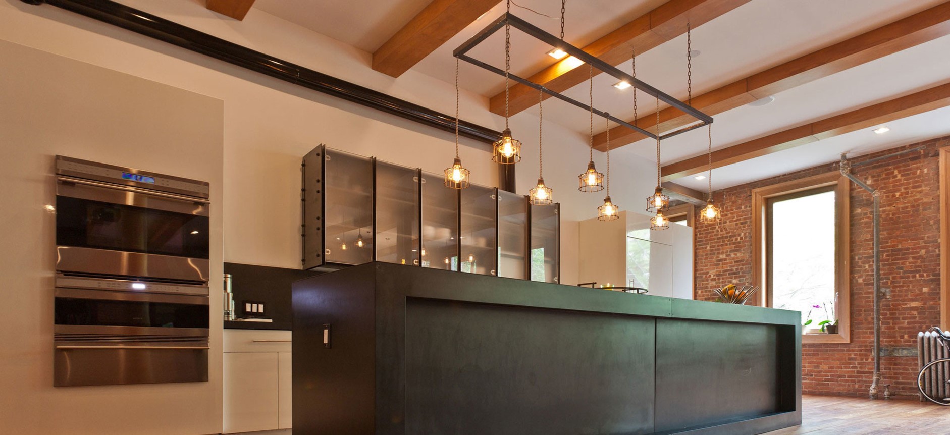 Любителям стиля лофт рекомендуется установить несколько небольших люстр с металлическим абажуром. Они очень выгодно смотрятся над обеденным столом, если расположены в один ряд.