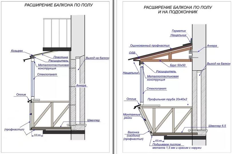 Немаловажное значение имеют особенности конструкции помещения — в частности, периметр, расположение перил, количество окон, конструкция крыши, состояние основания. На этом этапе нужно определиться и с методом расширения — по полу или подоконнику.