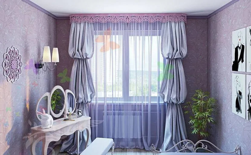 Органзу легко драпировать в замысловатые украшения. Яркая глянцевая поверхность этой ткани светится и красиво переливается на солнце. Невесомые на вид ламбрекены из органзы часто крепят в детских комнатах.