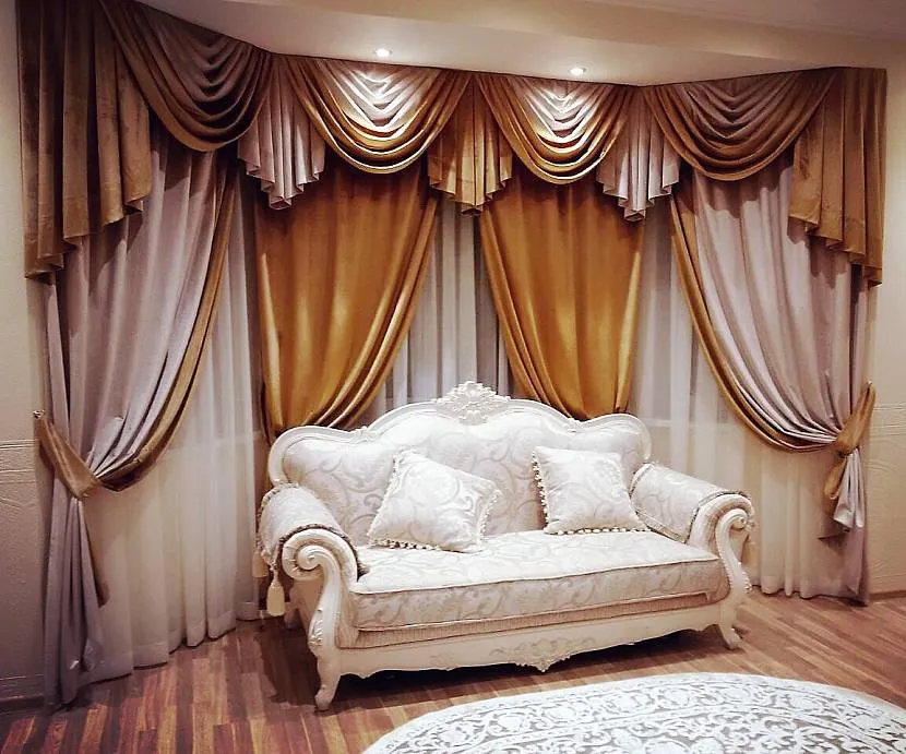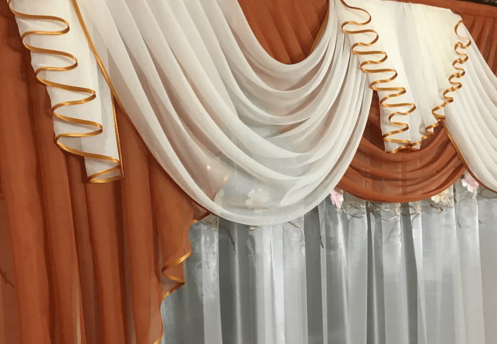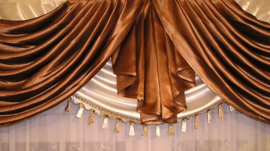Сваги – свободно провисающие полукруглые дуги материи со складками. Они дополняются всеми возможными декоративными элементами.