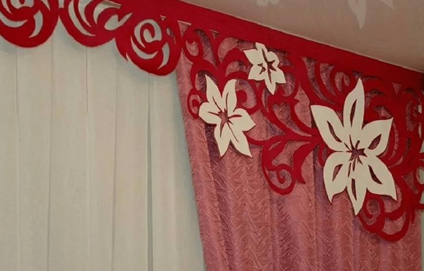 В планочных конструкциях и ажурных бандо часто используют фетр. Такие ламбрекены крепят на карниз с помощью специального липкого слоя.