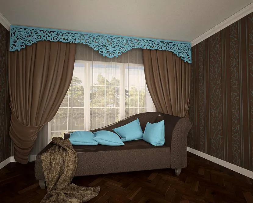 Резное бандо для штор бывает двух видов: фигурное (элементы различной высоты) и планочное (рисунок, повторяющийся по всей длине).