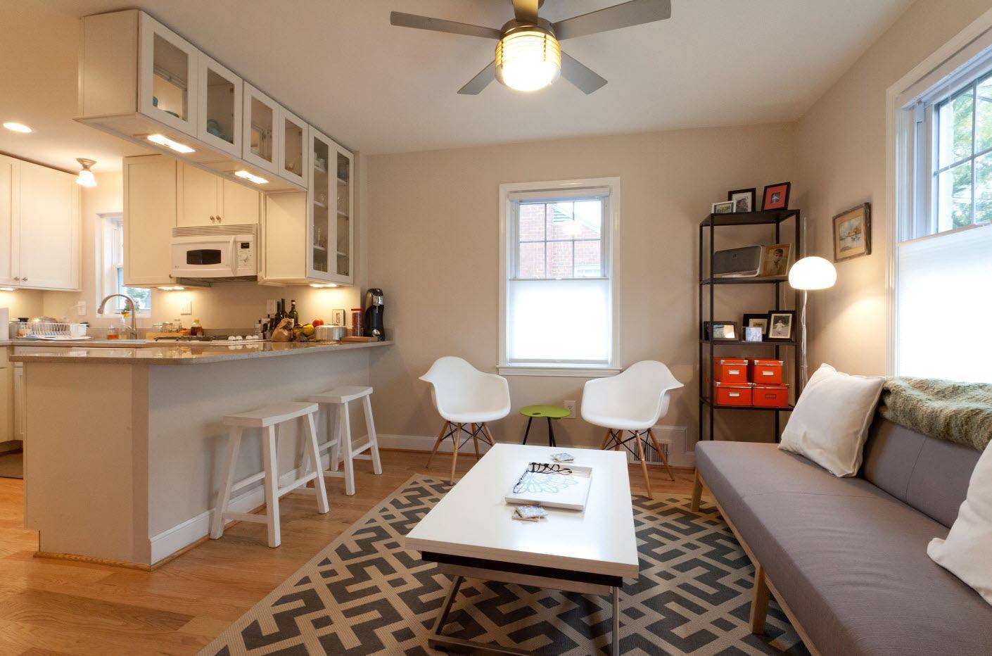 Данный стиль будет находкой для малогабаритных квартир. Барная стойка здесь служит разделителем между гостиной и кухней. Ее стиль, форма и цветовая гамма должна повторять очертания мебельного гарнитура. В таком помещении стойка может успешно заменить обеденный стол, что сделает его удобным и эргономичным. Рядом будут отлично смотреться высокие стулья.