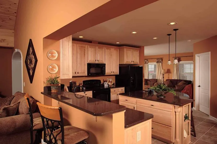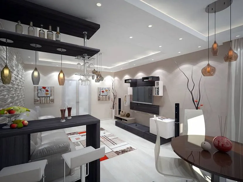 Барная стойка между залом и кухней — удачный вариант зонирования. Он подходит как для просторных помещений, так и для комнат с более скромной площадью.