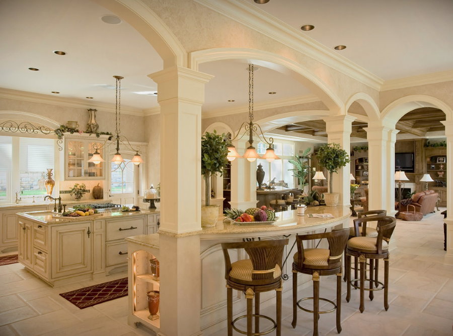 Вместо перегородки разделить пространство гостиной и кухни может стол или барная стойка. Кухонная часть при этом не становится отдельной и полностью изолированной, однако, мебель придаст этим помещениям четкое разделение на зоны. Благодаря этому квартира будет более упорядоченной и функциональной. Хорошая идея также организовать буфет в сочетании со столом или кухонный остров с обеденной зоной. Такой мебельный элемент визуально отделит кухню, а хозяйка получит большую рабочую поверхность.