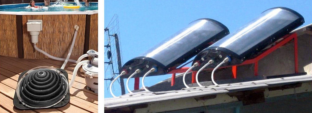 Проблему решает солнечный подогрев. Специально для бассейнов выпускаются гелионагреватели, дающие большой поток воды при относительно невысокой температуре, слева на рис. Обычных солнечных панелей здесь понадобилось бы более 10 кв. м.