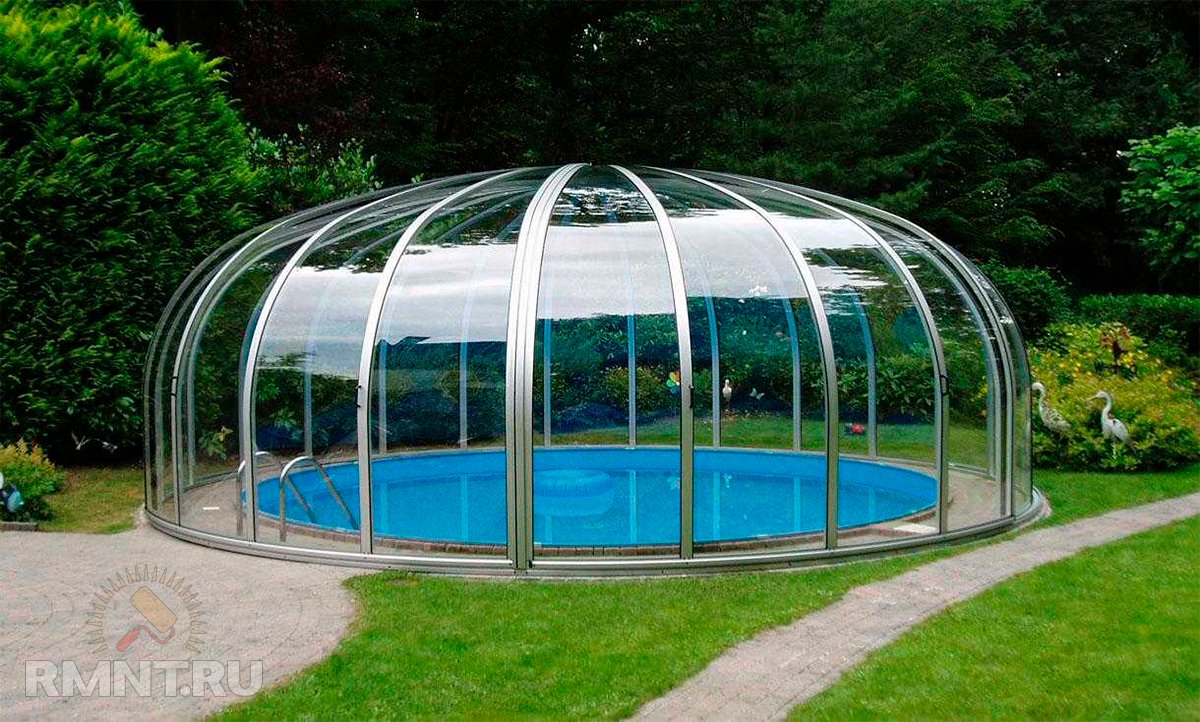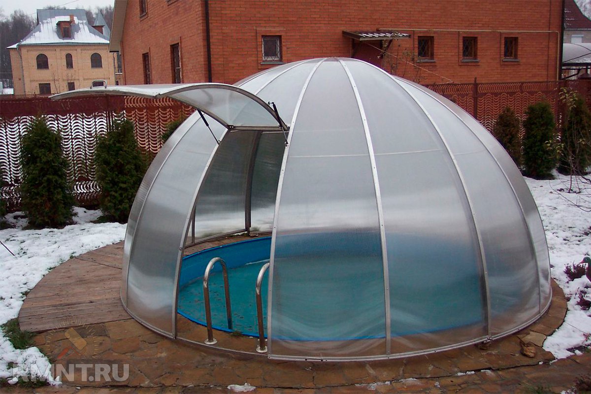 - куполообразные. Этот тип идеально подойдет для круглого бассейна. Такая конструкция невероятно сложная в исполнении, требует большого строительного умения и материалов. Именно поэтому зачастую пользователи выбирают прямоугольные каркасные бассейны в теплице;