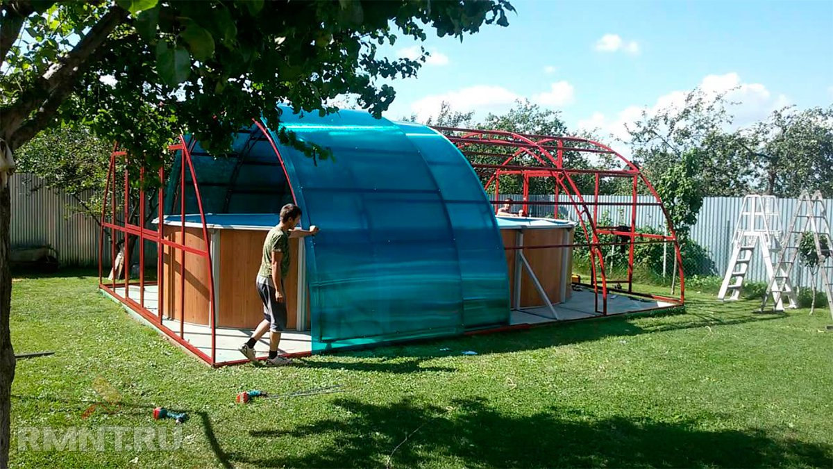 После сборки бассейна можно монтировать теплицу. При правильном выборе материала, навес из поликарбоната можно вписать в ландшафт любого участка.