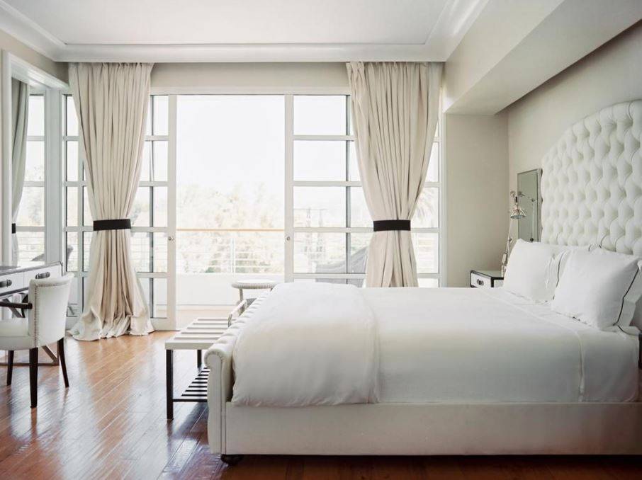 Белый интерьер спальни «разбавляют» теплые оттенки пола и черные подхваты на шторах