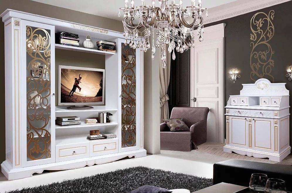 Классический. Вся мебель в этом стиле изготовлена из качественных, натуральных материалов, к примеру, беленого дуба. Гостиная имеет презентабельный, богатый вид, смотрится очень современно. Идеально дополняют белую мебель аксессуары, различные элементы из бронзы, позолота, натуральной кожи.
