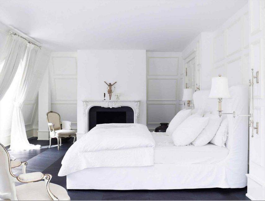 Снежно-белыми лучше всего сделать лишь отдельные предметы мебели, именно те, на которых необходимо заострить внимание, поставить акцент. Это могут быть светильники, зеркало, часть стены, на которой расположен камин, или даже ковер