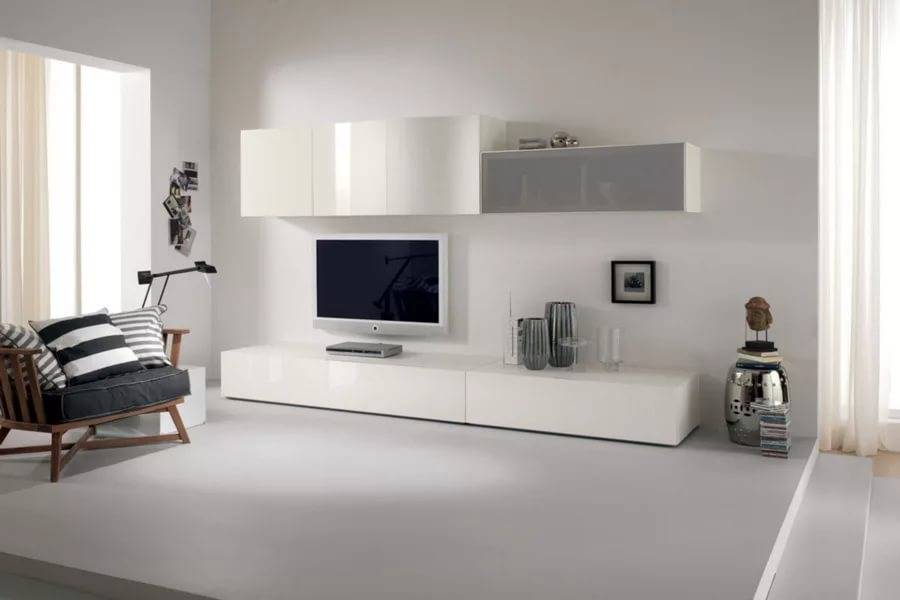 Современный стиль. Интересно, оригинально выглядит белая мебель в гостиной, выполненной в хай-тек, лофт и так далее. Она имеет простые, незамысловатые формы, изготовлена из стекла, металла, пластика.