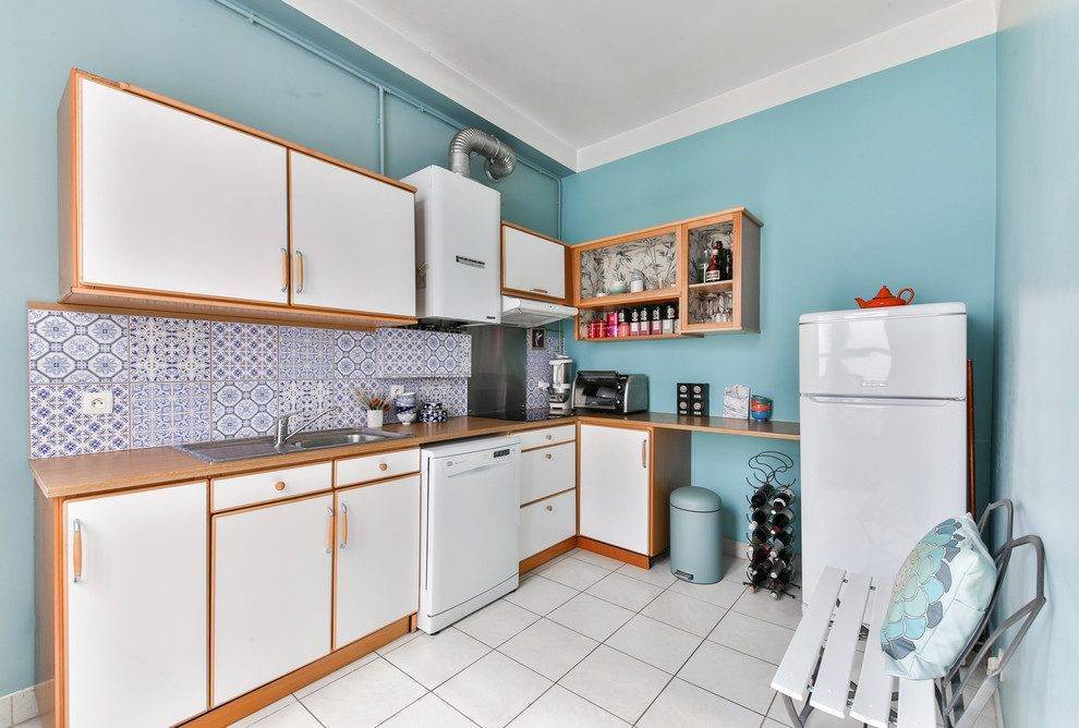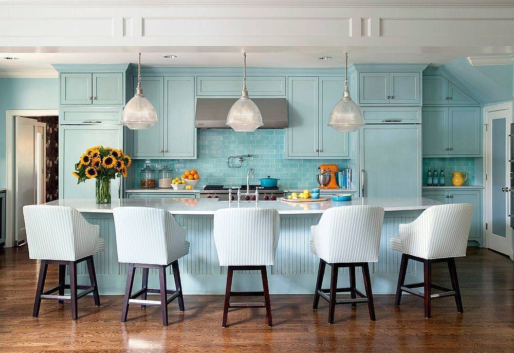 На любой кухне есть огромное количество предметов и поверхностей, которые можно покрасить в голубой, при этом произведенный эффект будет разительно отличаться.
