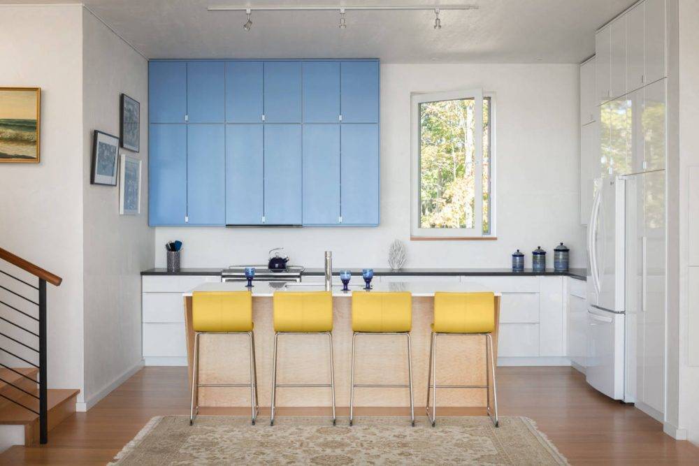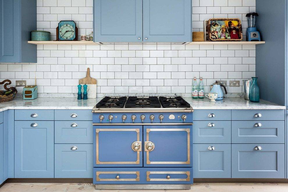 На многих фото кухонь голубой оттенок встречается не только в меблировке, но и в отделке: не бойтесь использовать его в больших количествах.