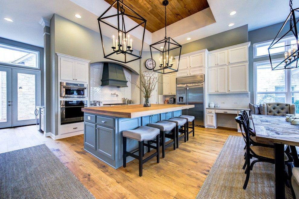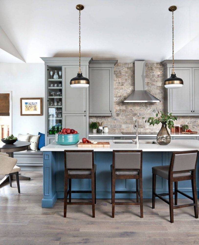 Бирюзовый кухонный остров отлично вписывается в общую атмосферу