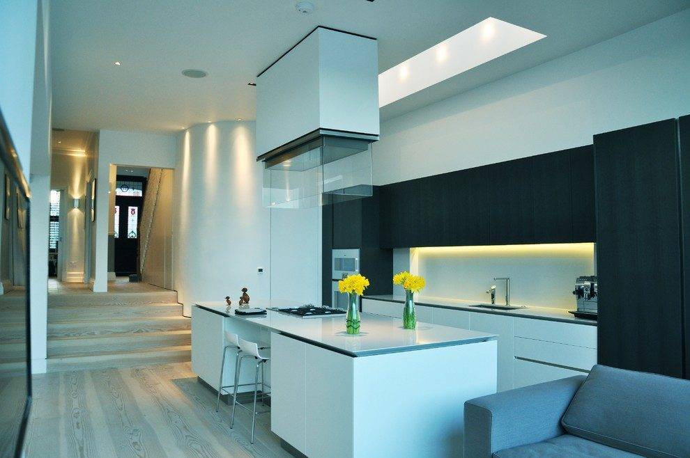 Модерн – белая кухня приобретает современный и даже немного футуристический вид. Кухонные фасады – гладкие ровные поверхности, с использованием пластика, лака или акрила. Пол – плитка, ламинат или износоустойчивый линолеум. Встраиваемая бытовая техника должна быть подобрана в стиль – она неотъемлемый атрибут дизайна. Освещение – многоуровневое, множество точечных светильников, создающих равномерное световое поле.