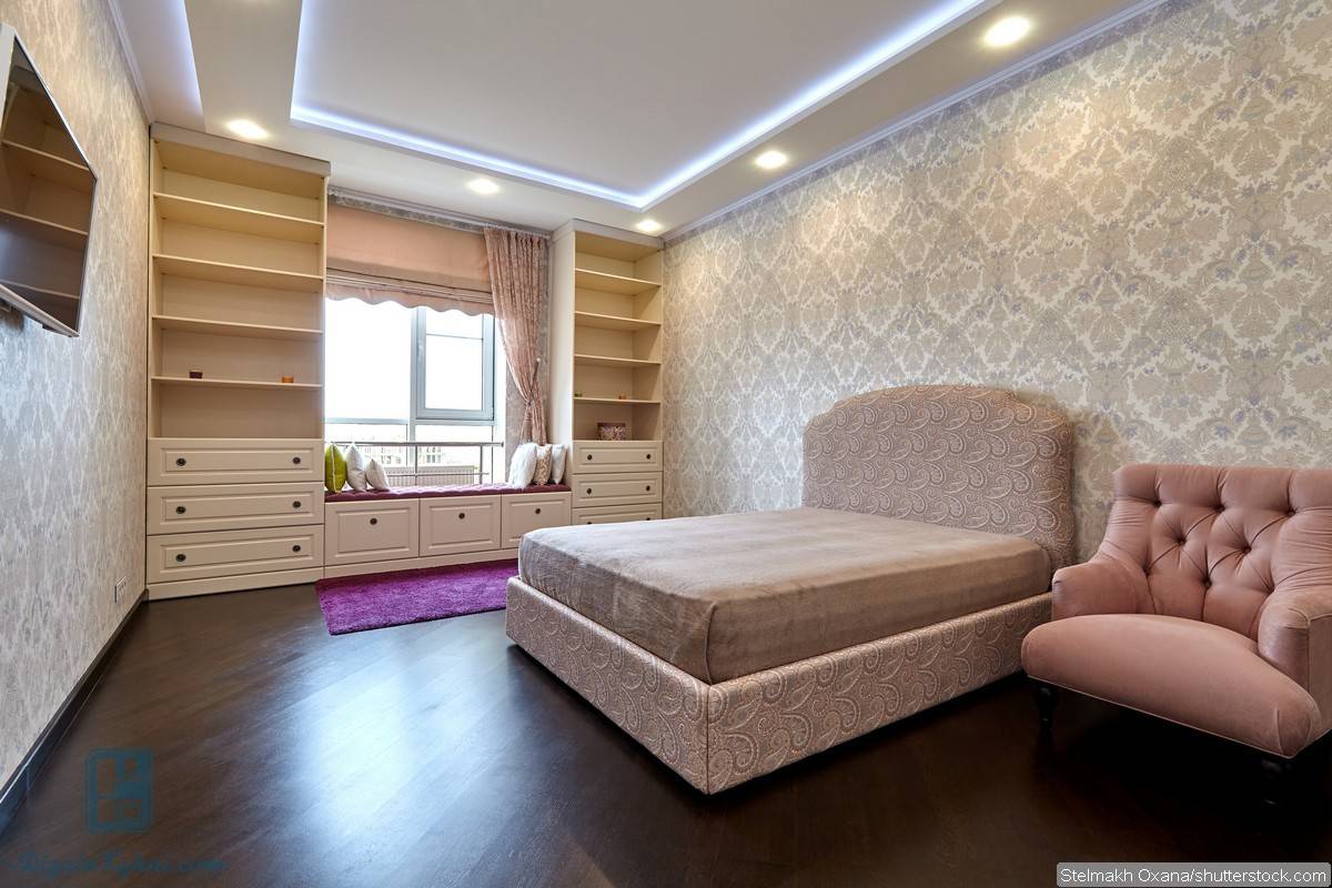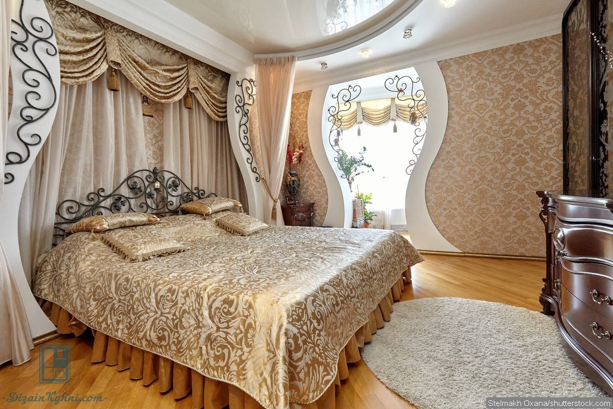 Классическим вариантом для такой спальни является светлый натяжной потолок. Кто-то отдает предпочтение оштукатуренному потолку. На нем изящно может смотреться аккуратная лепнина. Но такой потолок нуждается в регулярном обновлении, так как на нем могут возникать трещины, осыпание штукатурки. Потолок темного цвета следует делать только в том случае, если вы уверены, что он идеально впишется в общий дизайн помещения.