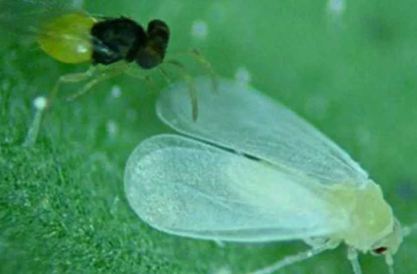 Энкарзия – один из наиболее эффективных противников нашего вредителя. Относится к категории паразитических наездников, личинка которого окукливается в оболочке хозяина. Примерно за неделю до высадки саженцев, поместите в теплицу 3-4 пакетика с паразитом. Самки самостоятельно найдут белокрылку и отложат свои эмбрионы в её тело, которые и уничтожат своего носителя.