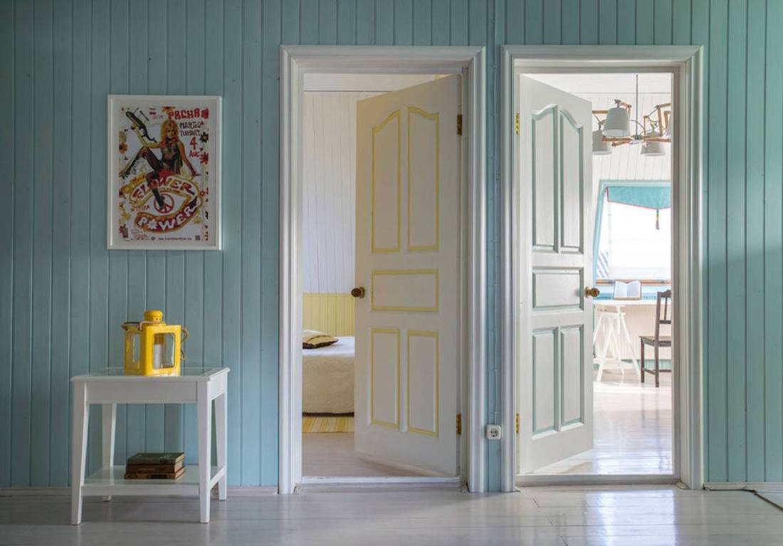 Роскошно вписываются светлые двери в интерьеры контрастных красок. Они отлично подчеркивают насыщенность и глубину фиолетовых, шоколадных, черных, зеленых и синих стен. Сине-белые сочетания являются основой средиземноморских декоров. Белое дверное полотно незаменимый элемент морского интерьера, интерпретируемого в лазурных и песчаных красках.