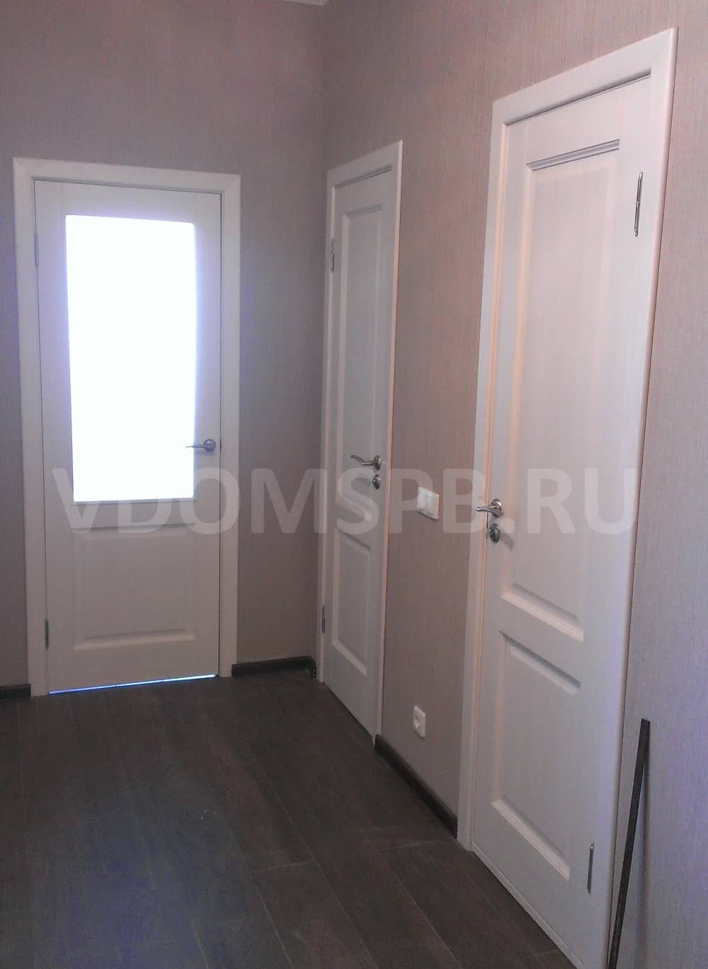 Гармоничное сочетание темного пола и светлых дверей