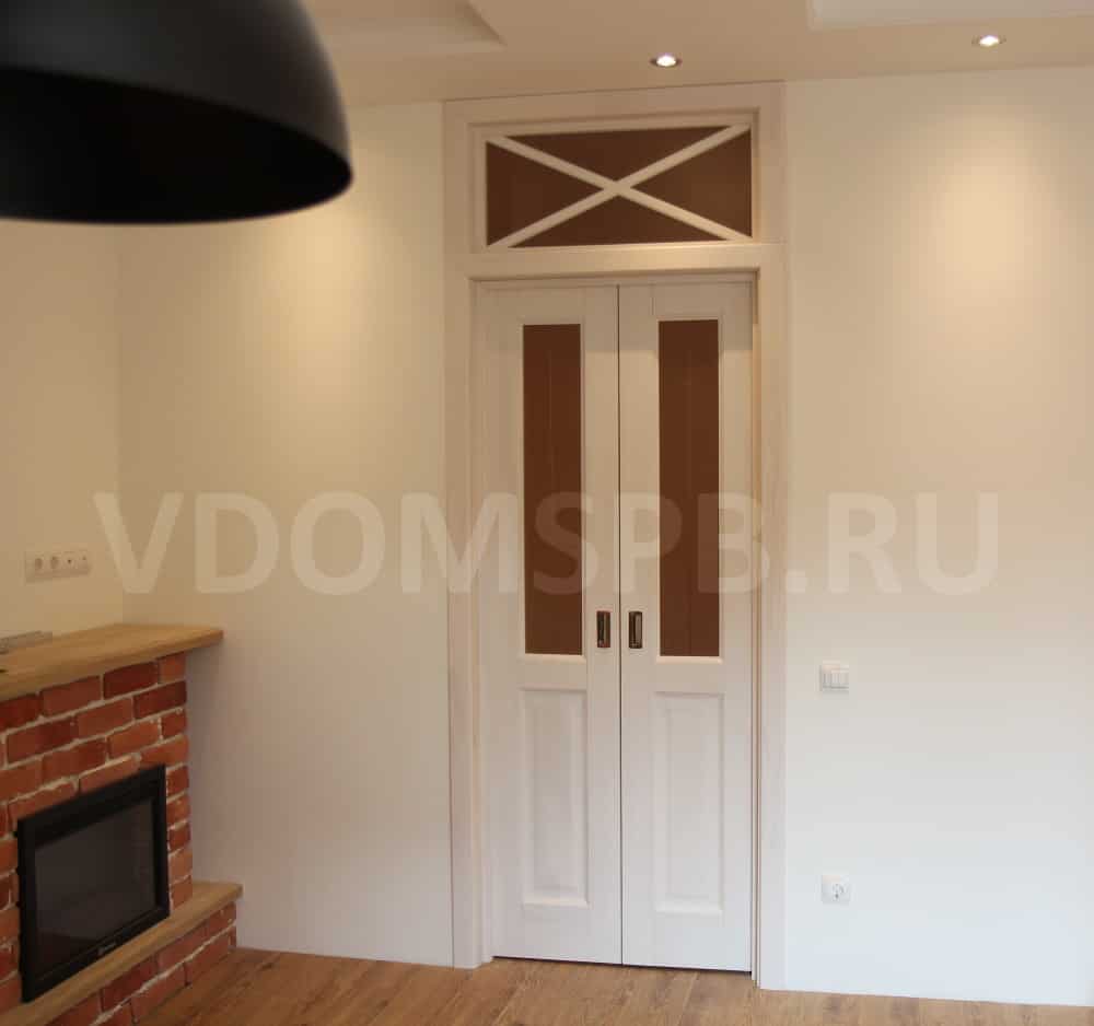 Коричневый пол и белая дверь с фрамугой в гостинной с камином