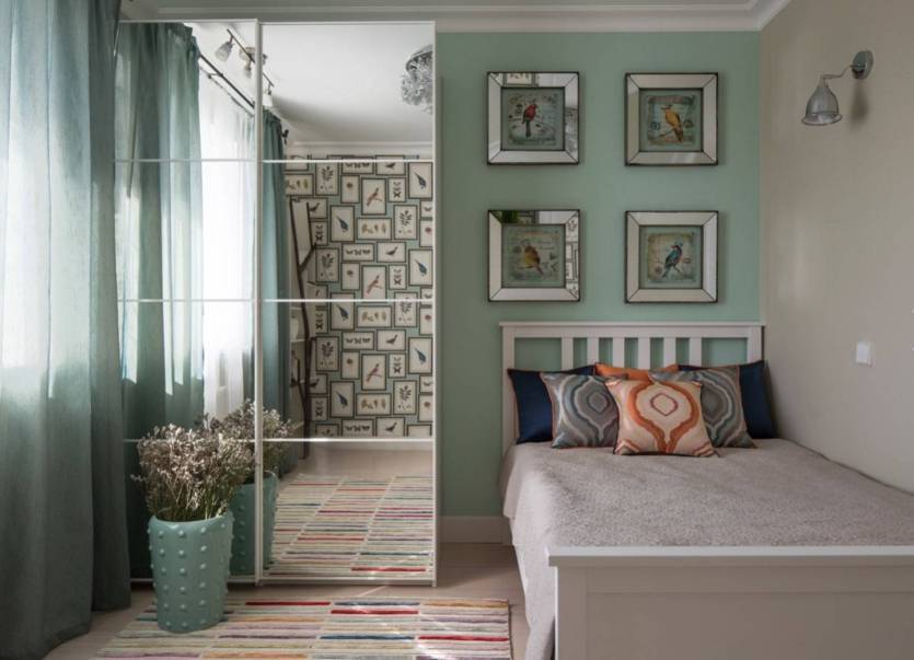 На заметку: выбирая пару или тройку компаньонов, учитывайте, что контрастные комбинации зрительно уменьшают пространство. Поэтому идеальным вариантом для компактной комнаты будут однотонные полотна и с рисунком, но не яркие сочетания.