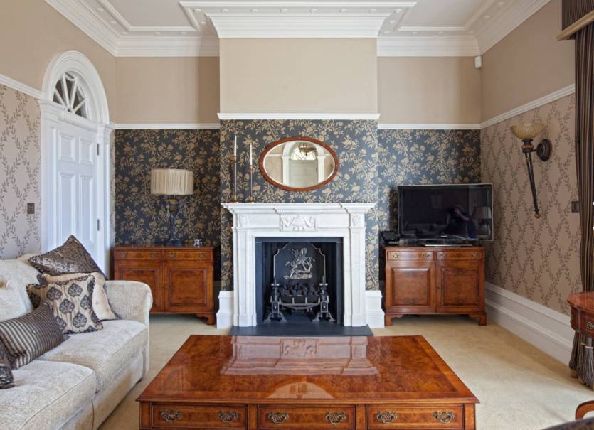 Важно при выборе обращать внимание на текстуру и принты. Для классического стиля подойдут белые обои в зале с нежными узорами и кружевами, где благодатным аккордом в обстановке гостиной будет большой камин
