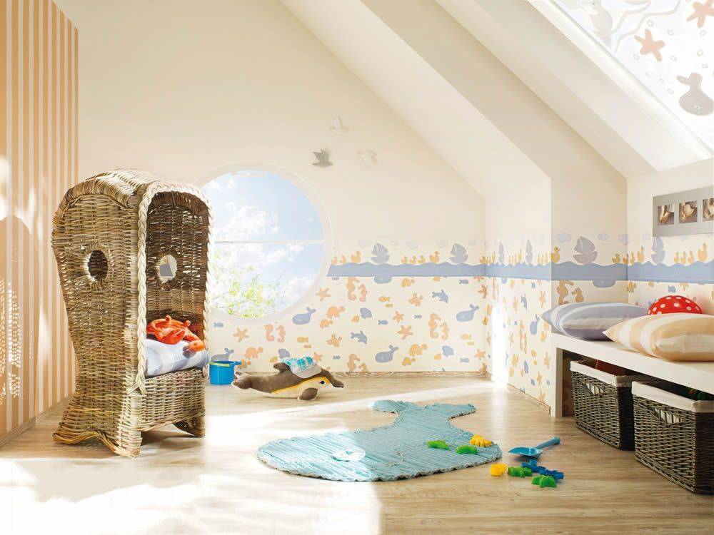 - Для детской комнаты специалисты советуют применить двухуровневую отделку. Нижний уровень покройте бумажными недорогими обоями, которые не составит труда заменить при необходимости. Для заполнения верхнего уровня подойдут белые обои.