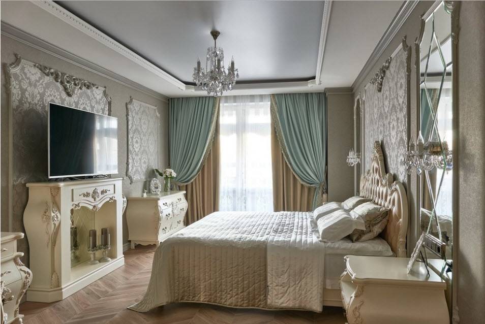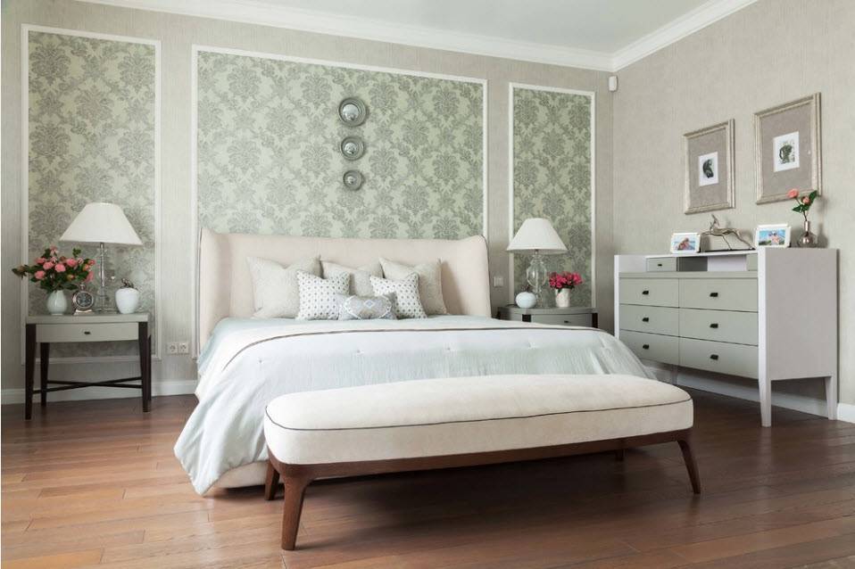 На фото спальня с серо-зелеными обоями, которые удачно сочетаются с белым цветом мебели.