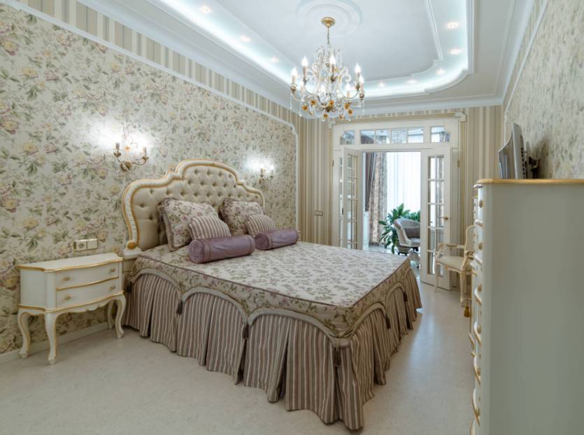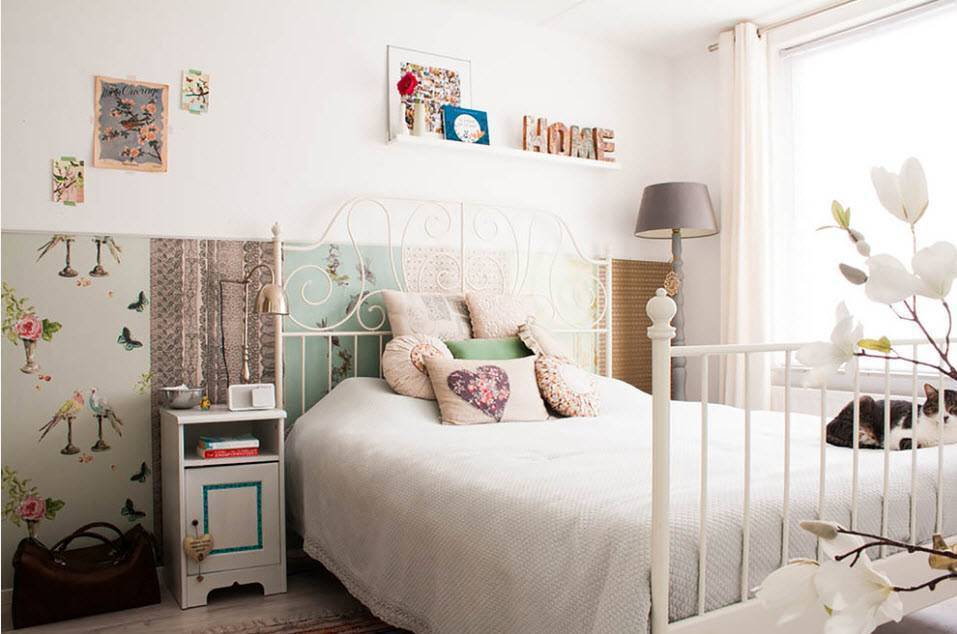 Если необходимо обеспечить грамотное дизайнерское оформление спальни , часто применяется на практике схема, по которой выделяются зоны кровати. Области у изголовья оформляются яркими обоями, оснащенными рисунком или рельефной частью.