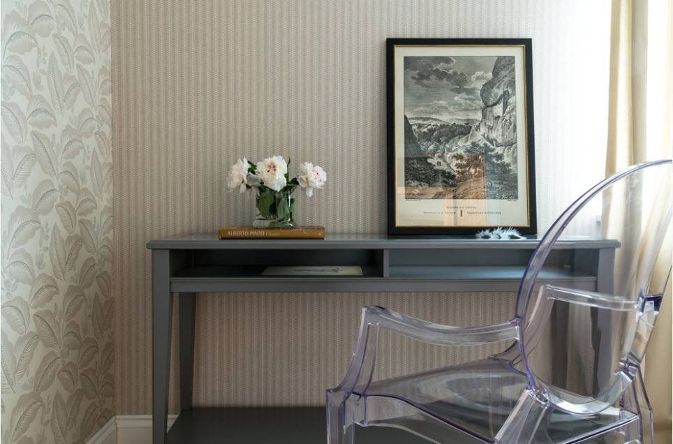 Такие комбинации идеально подходят для интерьеров в классике, где геометрия (обычно полоса или клетка) выступает компаньоном к рисунку (дамаск, цветы). Геометрию подбирайте спокойную, неяркую — тогда она не будет надоедать и поможет ненавязчиво структурировать интерьер, что для классики никогда не бывает лишним. Также хороши сочетания фото-обоев с цветами, комбинированные в интерьере с полосой.
