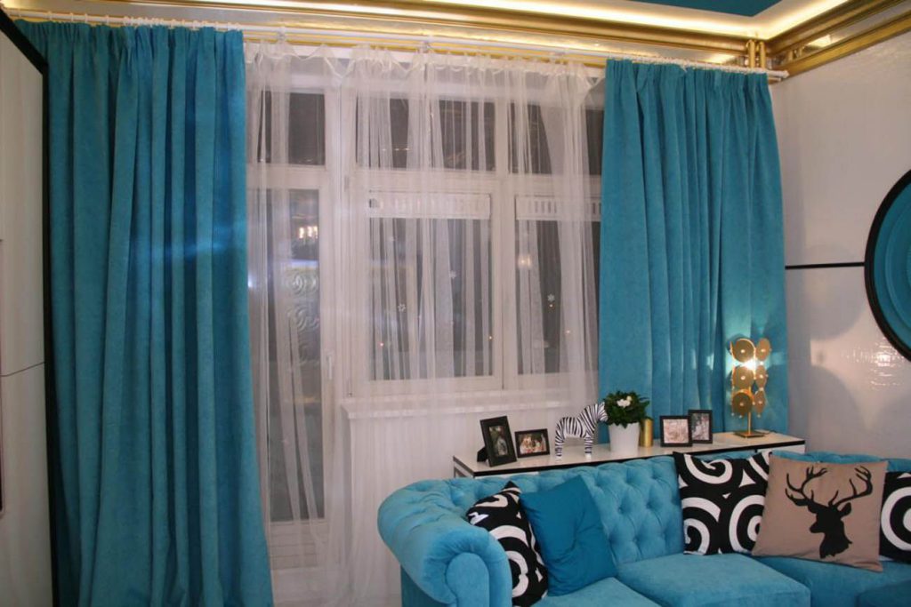 Однотонные бирюзовые занавеси, ниспадающие на пол, хорошо подойдут для комнаты со светлыми обоями и дизайном в стиле прованс. Ярко-бирюзовый цвет будет уместен в просторной гостиной с солидным интерьером.
