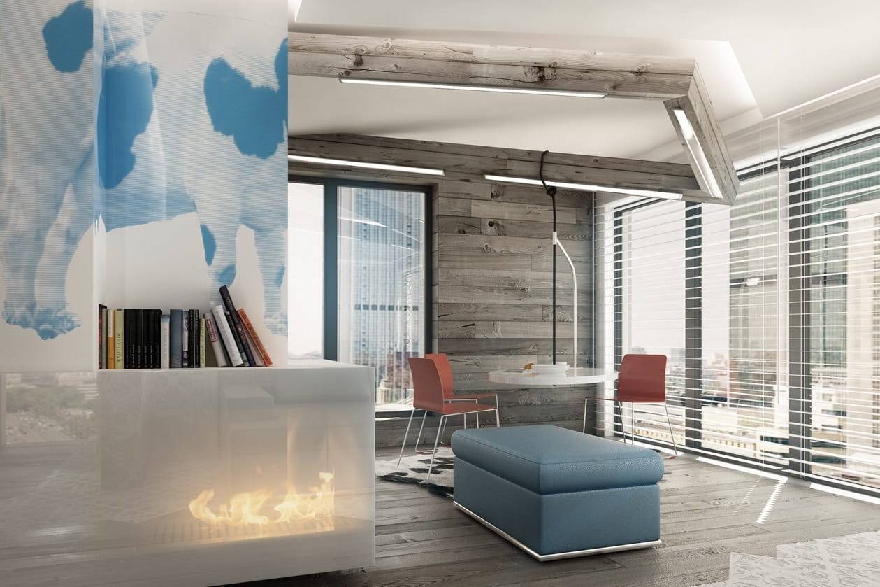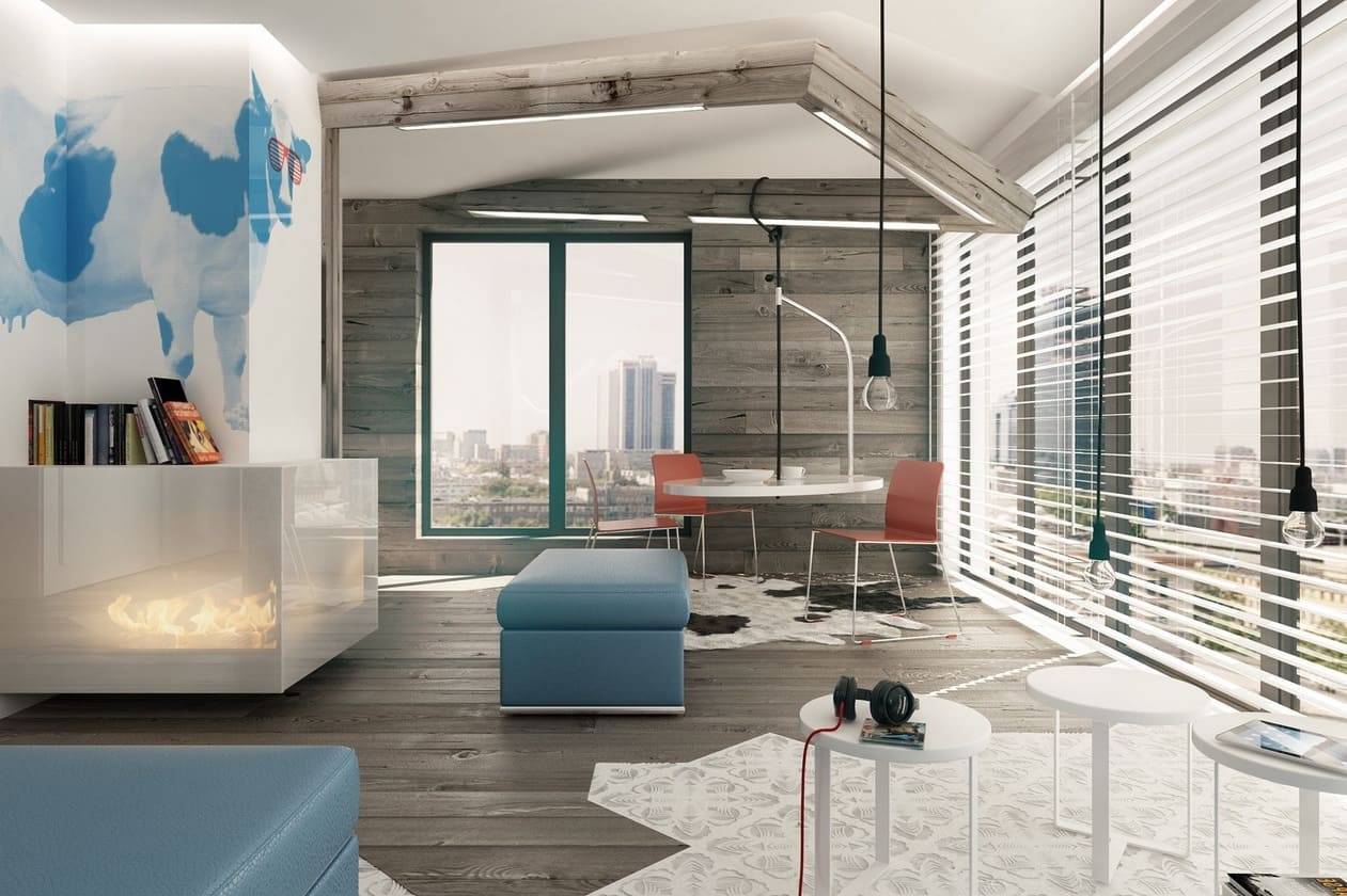 Современный интерьер с применением светлого ламината в просторной квартире-студии