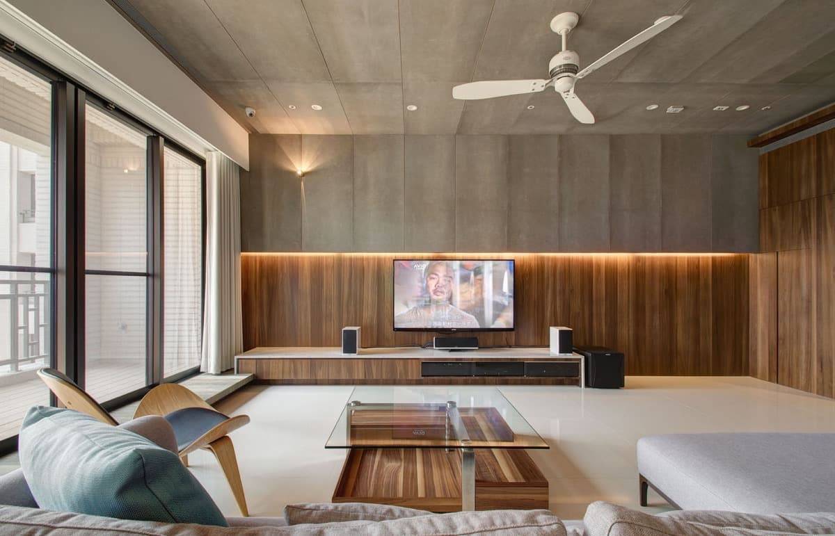 Интересный дизайн большой гостиной с натуральными материалами отделки