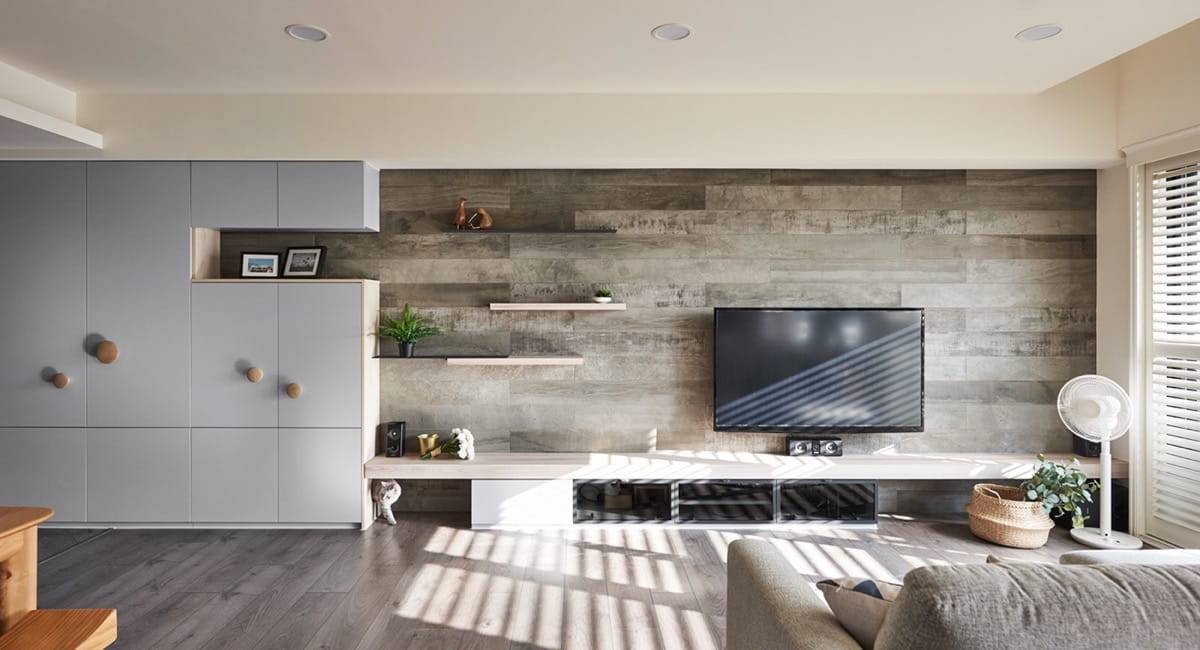 Нейтральные стены гостиной разбавит ламинат с фактурой натурального дерева