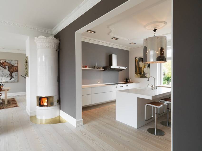 - белый цвет, к сожалению, непрактичен и очень маркий, поэтому если в доме живут маленькие дети и домашние животные, то стоит рассмотреть иные варианты отделки;