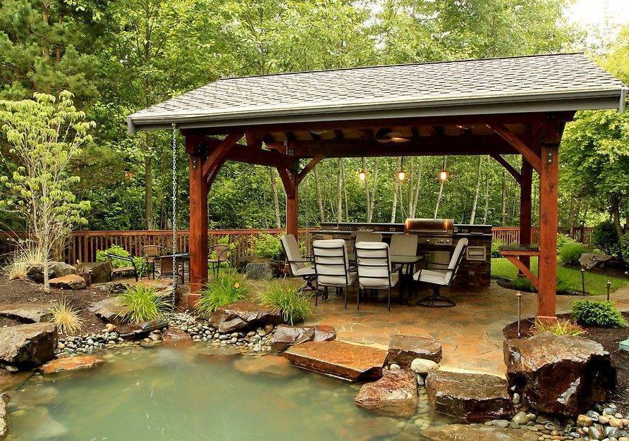- Для беседки лучше найти укромный уголок, где поблизости нет зелёных насаждений. Около неё можно расположить пруд, украшенный альпийскими горками или рокарием. Дым вовнутрь дома не попадёт и не помешает отдыху. Если провести в беседку коммуникации, то в ней можно организовать кухонный уголок со столешницей, раковиной и шкафом для посуды.