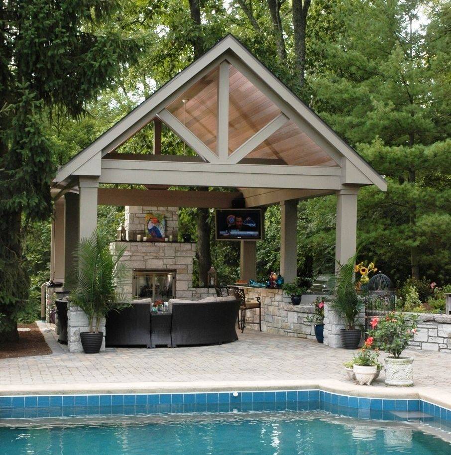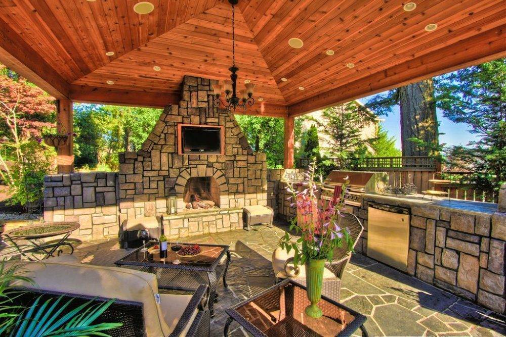 Беседку можно сделать романтичной, построив её из дерева. Опоры и навес оборудовать подсветкой или развесить светильники на стенах. Выложить и зажечь в ней камин, устроиться на мягких диванах и наслаждаться приятным отдыхом. Беседка потребует проекта. Фото представляет разнообразие дизайнерских решений.