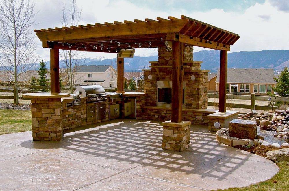 Стены кухни можно и не строить, а сделать их в виде решеток, однако все зависит от индивидуальных пожеланий и климата. Такое помещение выглядит, как беседка. Не стоит забывать, что главный атрибут открытой кухни – это печь-барбекю или мангал на выбор.