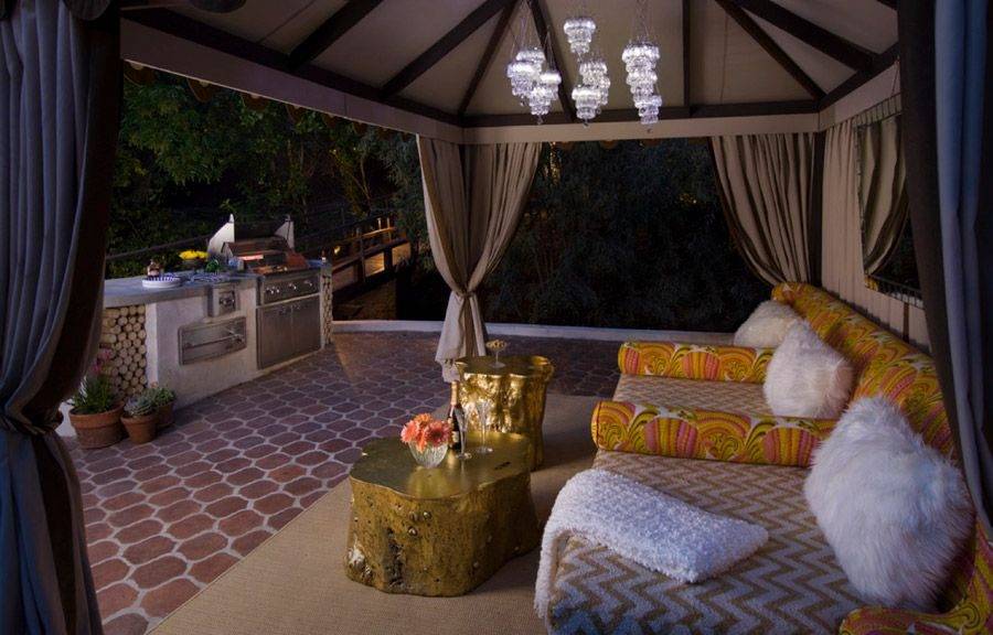 Когда все готово, выбирают мебель из влагоустойчивого материала для открытых вариантов беседок, затем добавляют аксессуары из текстиля и освещение.